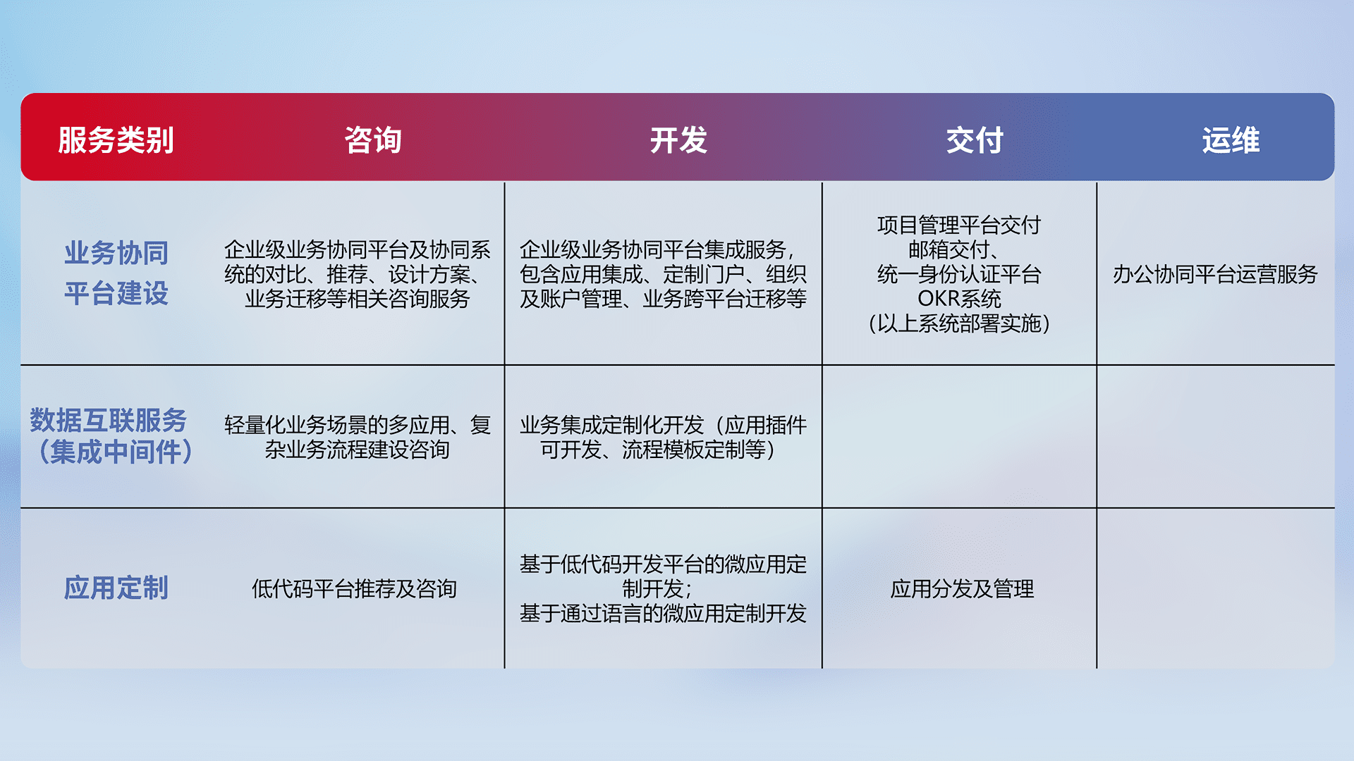 针对钉钉、、企微、、IDaas等平台级产品提供产品的规划、、、、方案、、、交付、、、、定制化开发等服务,,,,实现如统一协同办公、、、智能客户服务、、混合会议管理、、、智能数据查询、、、、等业务场景,,,实现数字化转型。。